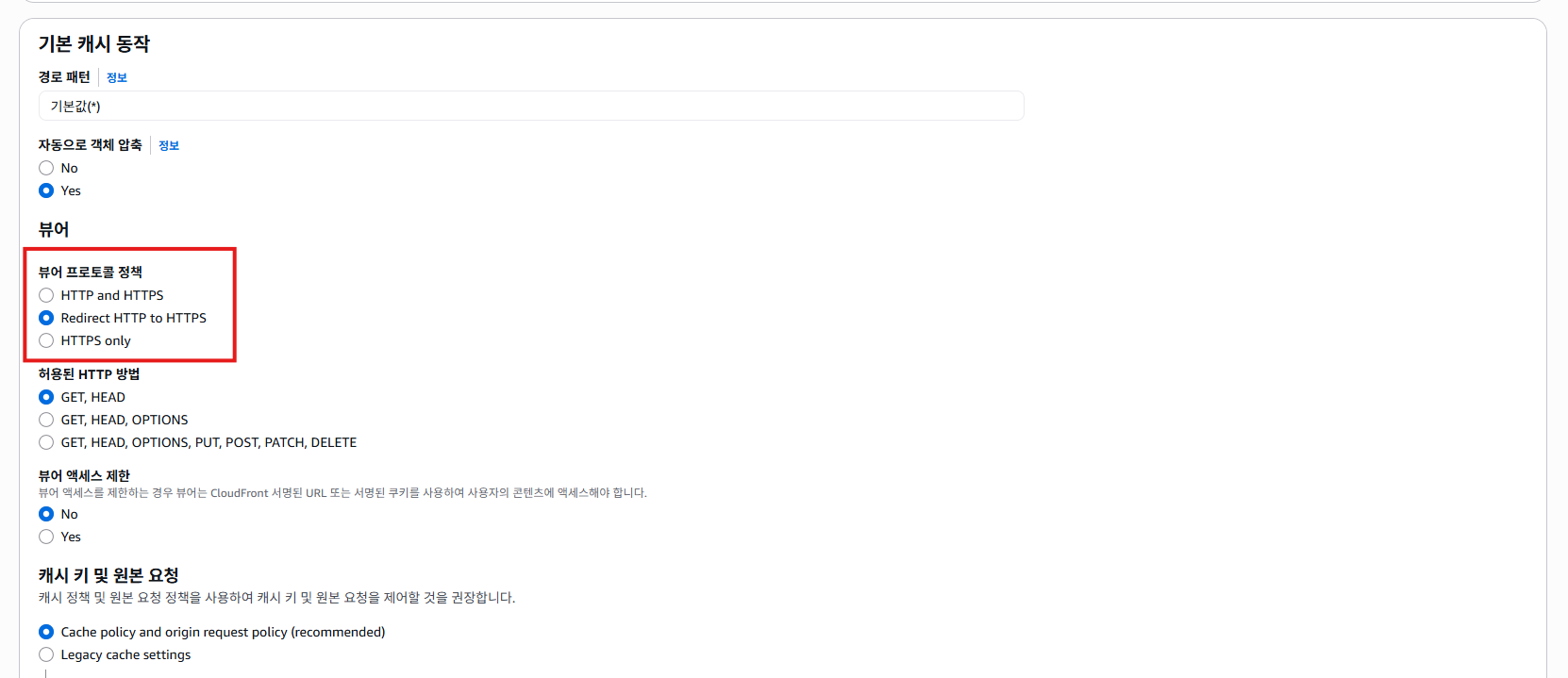 - 뷰어 프로토콜 정책 - http로 접근이 오면 Https로 리다이렉트처리
