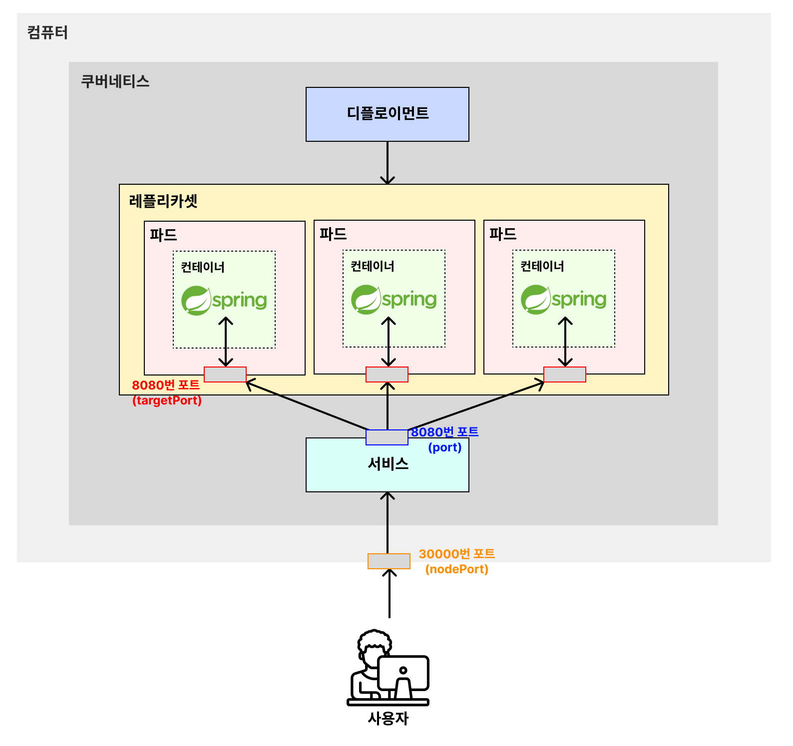 port: 8080 # 쿠버네티스 내부에서 Service에 접속하기 위한 포트 번호 (컴퓨터 - 서비스 최초접근)