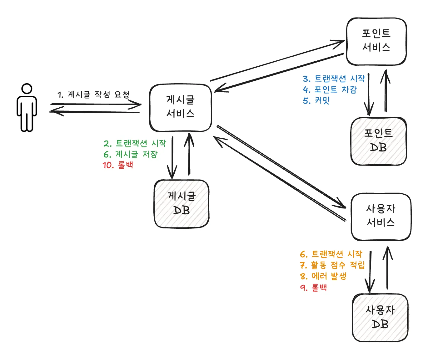 - 모놀리식 아키텍쳐 구조에서는 동일한 서비스, 디비에서 작업하기 때문에 트랜잭션이 문제가 없었으나